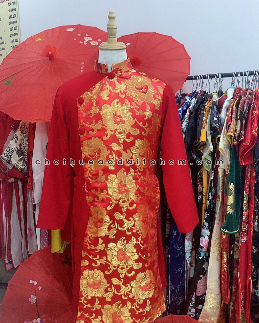 Áo dài nam ADN08 gấm đỏ hoa vàng