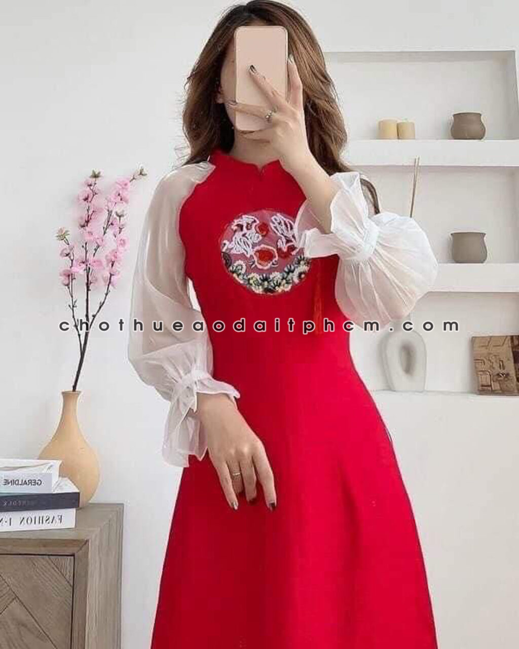 Áo dài cách tân ACT11 đỏ tay bồng thêu