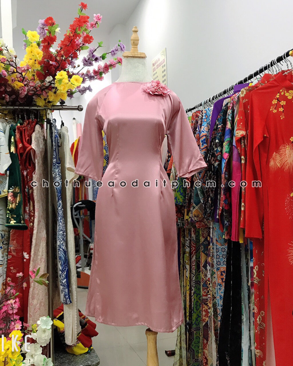 Áo dài cách tân ACT64 hồng bóng đính hoa