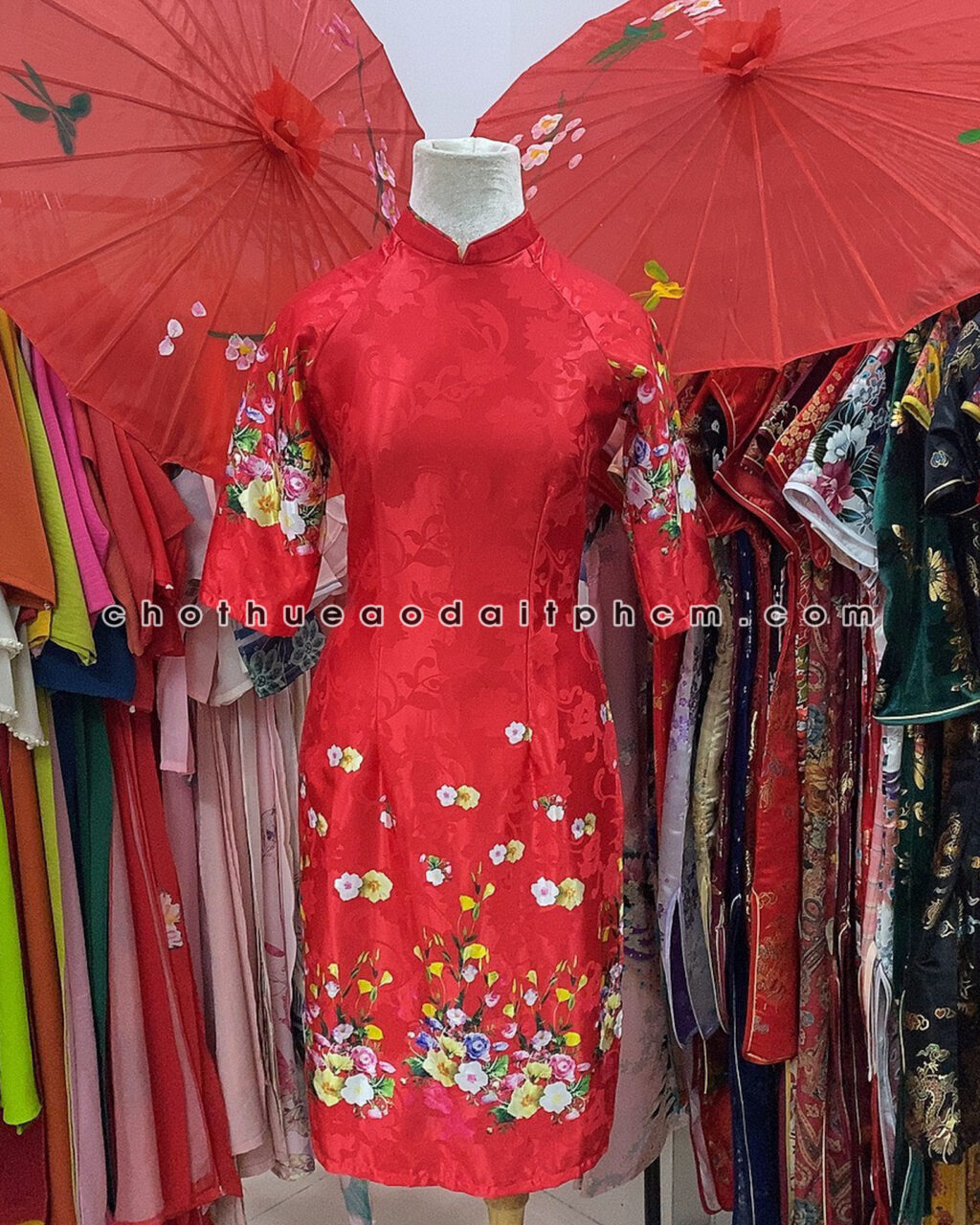 Áo dài cách tân ACT61 gấm đỏ hoa lá