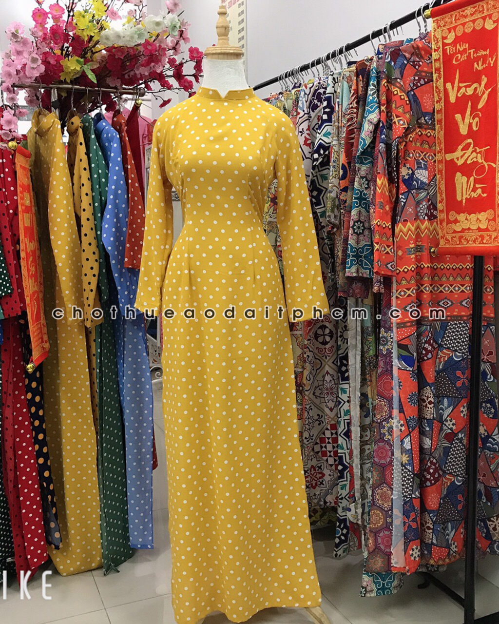 Áo dài chấm bi ACB20 vàng ko cổ bi trắng