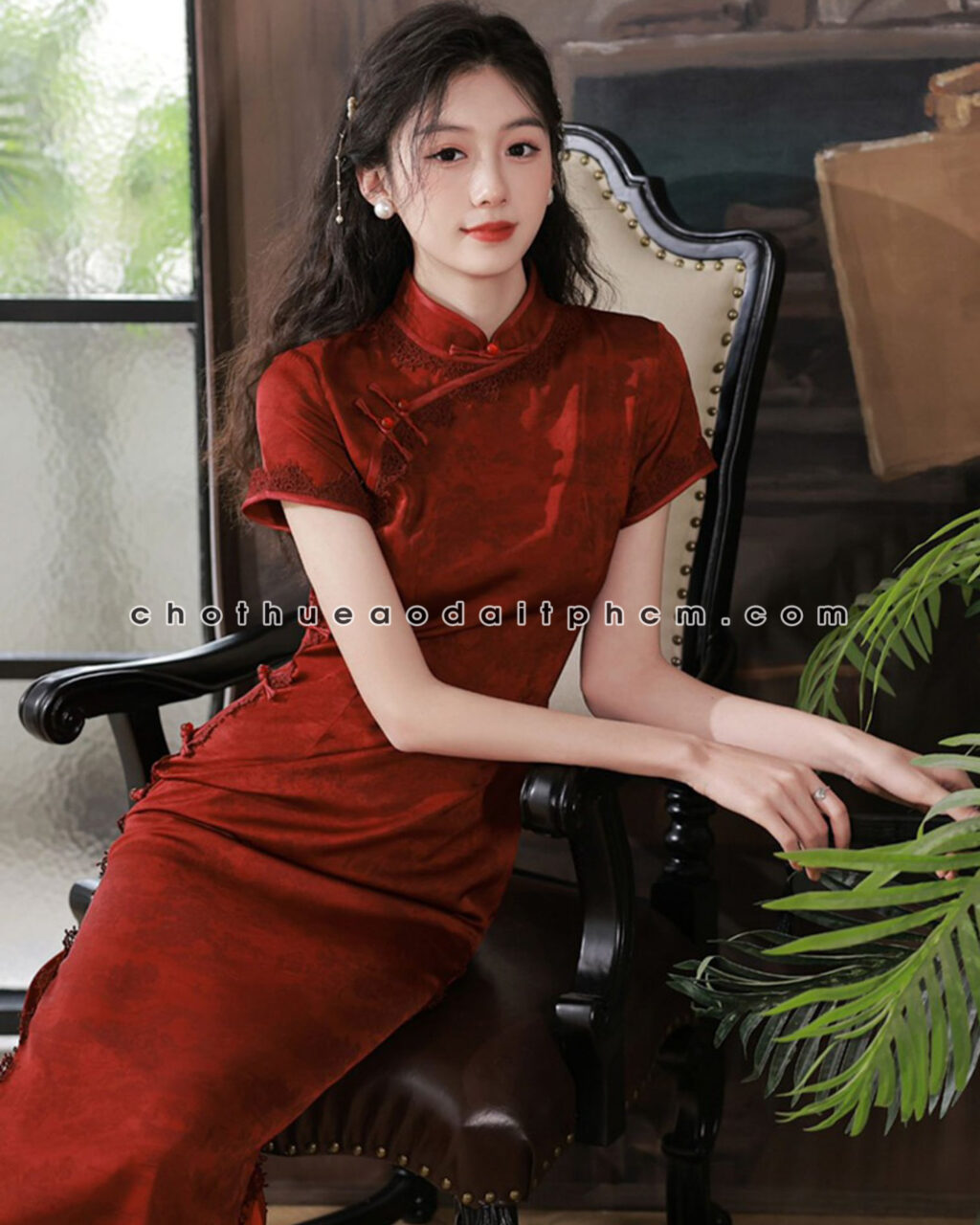 Sườn xám SXD29 gấm đỏ đồng tiền
